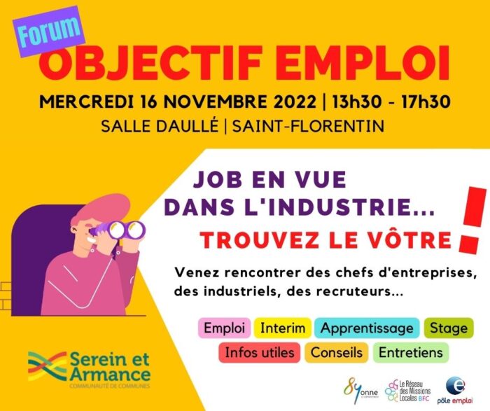 Avis à tous ceux qui veulent travailler dans l’industrie 🤩 Rendez-vous le 16 novembre 2022 à la Salle Daullé – Saint Florentin pour le forum objectif emploi ! Retrouvez l’équipe d’ACS intérim de 13h30 à 17h30 ! Entrée libre et gratuite !